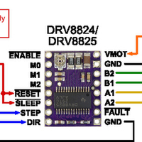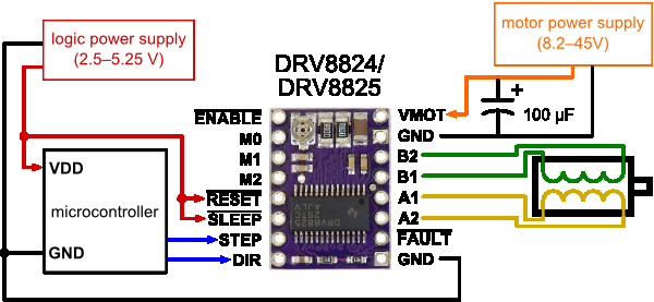 What kinds of motors do they use? Bipolar stepper motors. Emma has provided me the motor to use. The motor driver is the DRV8825. Information here. Chip datasheet here. And I should use a 100uF capacitor, capacitor datasheet here. And the motor I will use is the SY42STH38-1684A, motor information here, motor datasheet here.