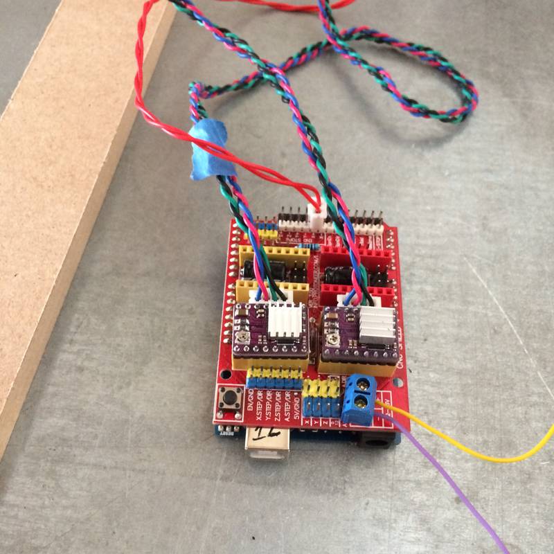 The shield has space for four motor drivers. You can see that we have two plugged in (the purple units). The twisted wires plugged in just beside the drivers are the wires to the motors. The purple and yellow wires leading offscreen are leading to a power supply, powering the motors. The shield has each driver's STEP and DIR pins wired to specific pins of the arduino. The microstep options that are normally selected by connecting to pins on the motor driver (M0, M1, and M2 in the schematic above on this page) are set by using jumpers on the board.