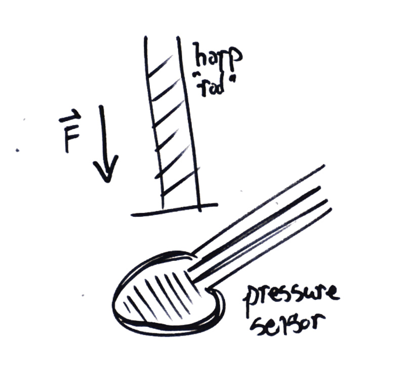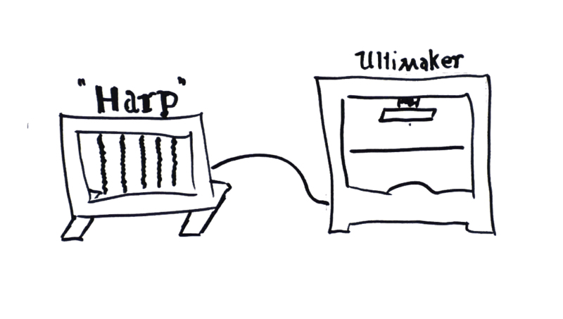 It is a 3D printer harp. It is a musical instrument interface. It will control the extruder head of a 3D printer to move in shapes that will create different different sound expressions. The proposed interface currently resembles a cristal baschet, an instrument whose sound is made by stroking glass rods. This will be a 3D printer "harp", where several rigid rods are stroked to generate the sound. Each rod will cause the printer to perform a unique expression, and the pressure applied when stroking the rod will control the sound by changing the speed at which the printer is moving. A pulsing LED will communicate the applied pressure.