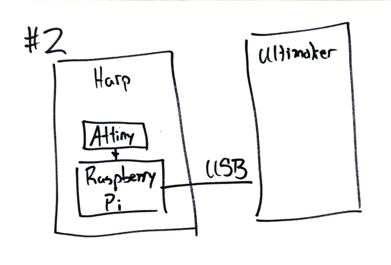 Many 3D printers use an FTDI connection to communicate to the world. A USB host is required for this. My microcontroller skills are not developed enough to do this in the time available. So a microcontroller, so an ATTiny manages the sensors, and sends the data to a Raspberry Pi, which manages the control logic and sends GCode to the printer through USB.