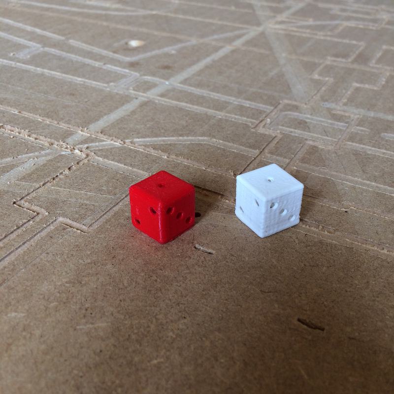I reprinted the die on the same machine, using red PLA that was already loaded in the machine. I changed the layer height to 0.15mm, and doubled the fillet amount in the model in Fusion 360. The result is marginally better. The walls are still weird, and there appears to be a vertical strangeness that appears even under a hole in the wall, which makes no sense. The elephant's foot is also marginally better, but not enough to make a difference. 3D printing is hard! Here's a picture of the new die right out of the printer, and the new die beside one of the original dice.