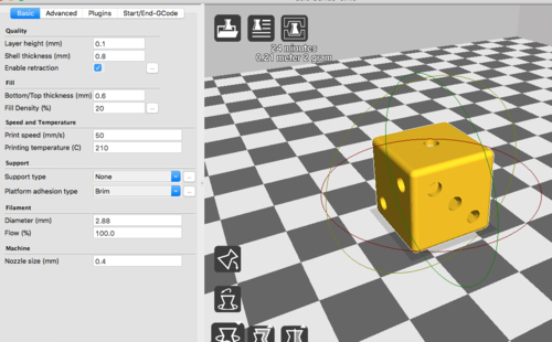 - It's a good idea to select "brim" platform adhesion type. It allows for extra material to be garbaged while the printer is starting up.