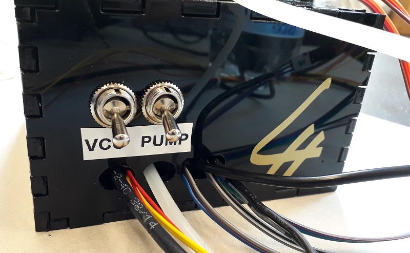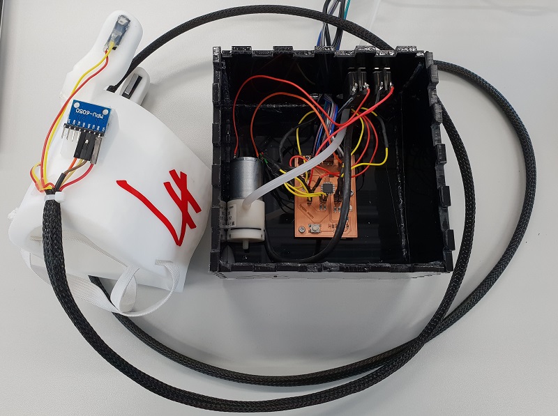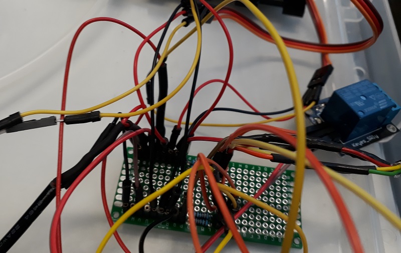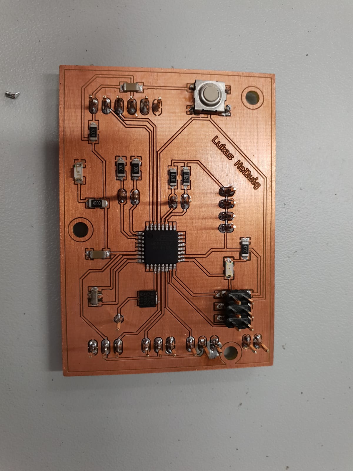 See here the milled board. During the postprocess I found a bridge in the layout but with a sharp knife I could fix it. I decided to divide the programming and the programmable ports so my board gets his pins at its back. That also makes the box looks more sorted. See here the front of my board. I also added my LH sign. To order and wire the mass of cables I added a second board. These boards are designed and build quite fast so for developing a individual assistant system at the platform of my final project you don´t need to have a PCB milling machine. Just solder the individual parts by yourself. Finally I added two dip switch to activate the voltage source for the 12V pump and the 5V for the rest of the system. Take a look inside the black box. Looks pretty unordered but it works 😉 After wiring all the parts and put them together let´s make them move in the software part