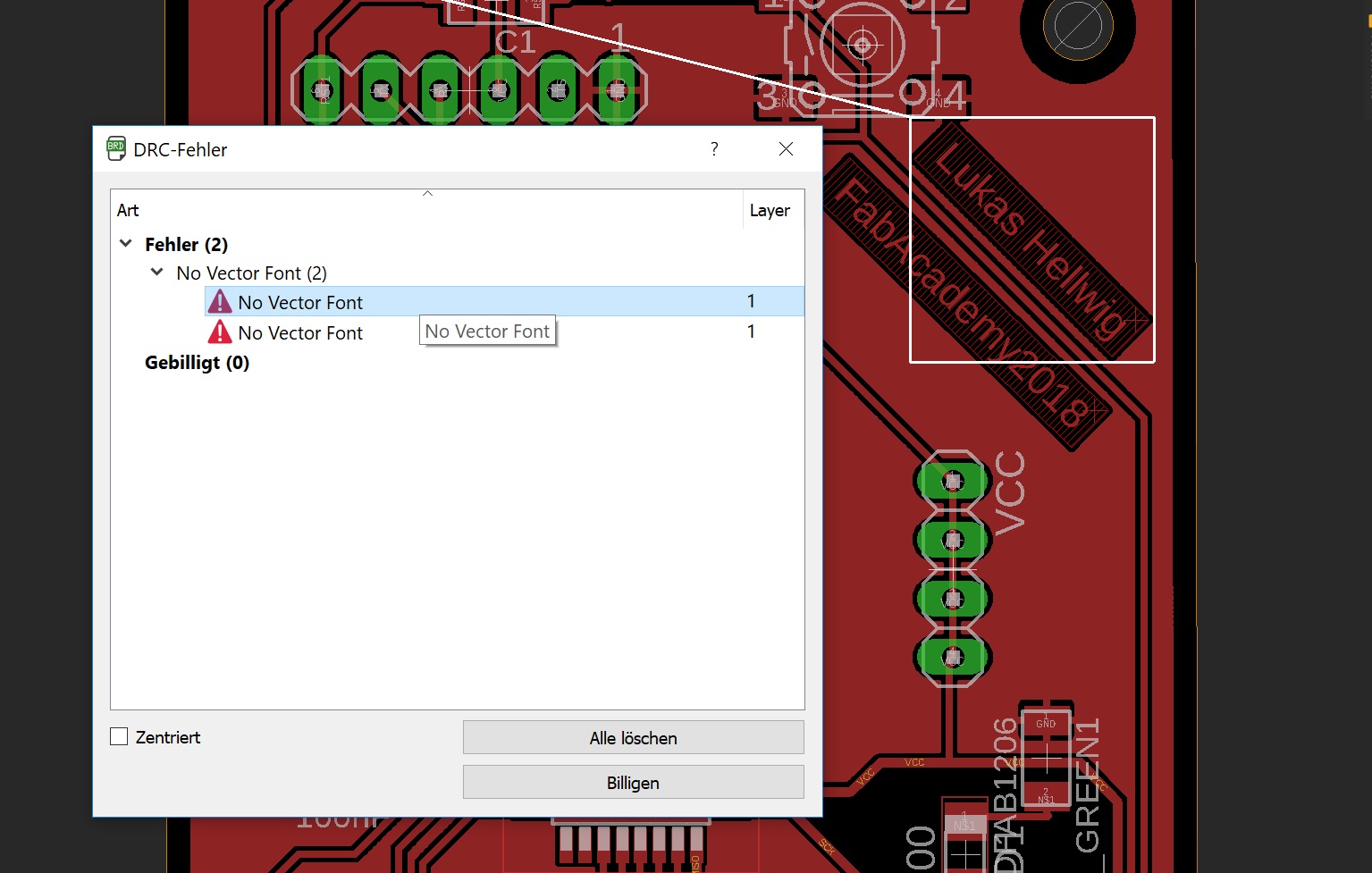 In the first step the DRC noticed a problem with my label, but that is not critical and could be deleted.