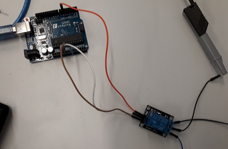 For the electrical part I divided the complete system in some subsystems to get the single parts work. Some parts were new for me so I had to test them before. For example the relay needed to be tested. In the first step I used an Arduino to make the first tests and to develop a scheme for my own board. It makes more sense to build the complete system and develop a PCB with the finished scheme than making a new one for every single step. After testing the relay, I added a button to simulate the button at my foot holding. This button should start the vacuum pump to grap objects with the robot arm. In the next step I added the sensor and the servos. It was a lot of work to generate repeatable sensor data and transform them into moving operations. As you see in this stage I used a breadboard to wire the single parts. In the final project I wanted to find a more professional solution. See here the first moving test with the combination of the sensor an the servos.