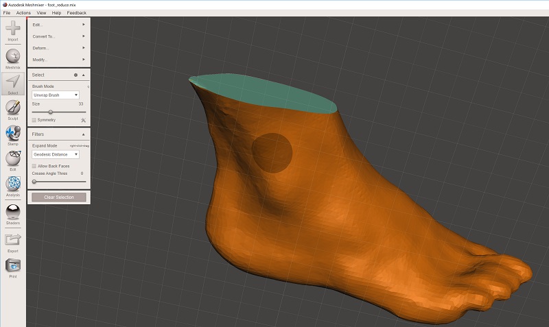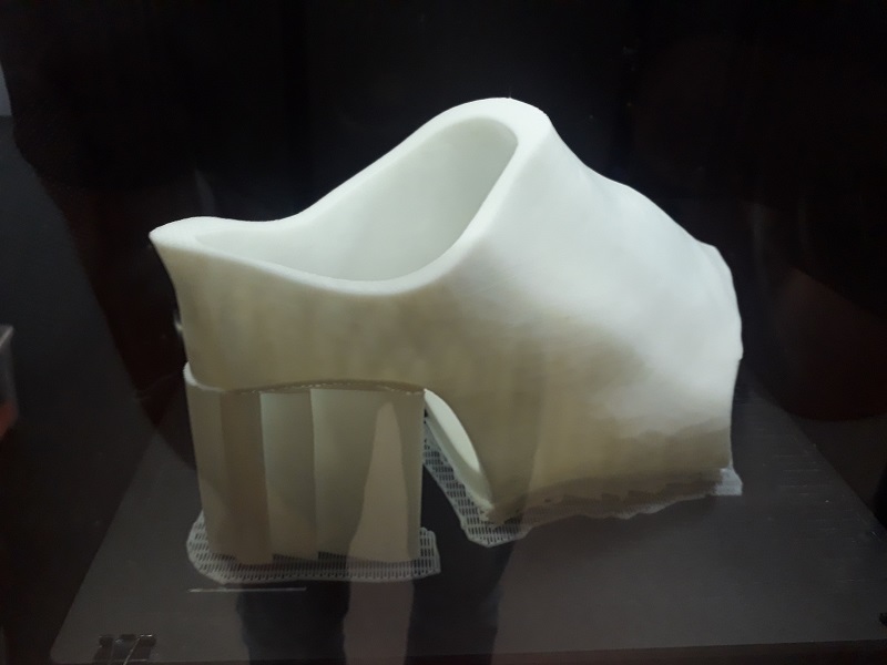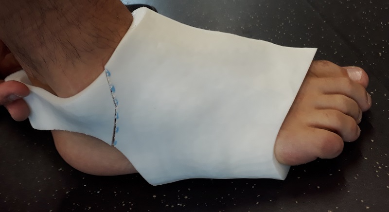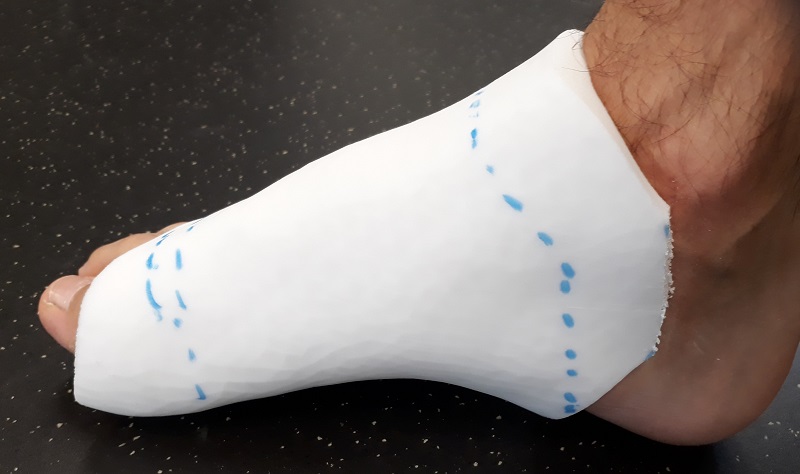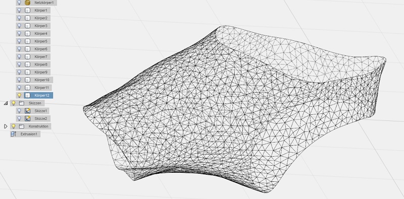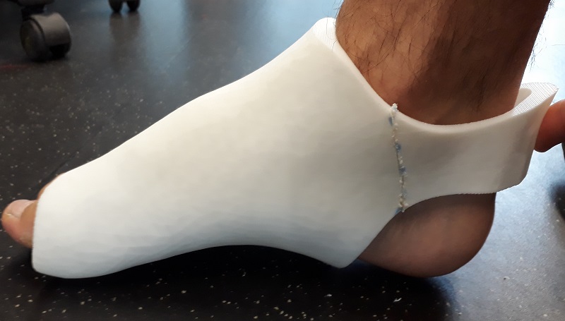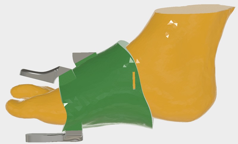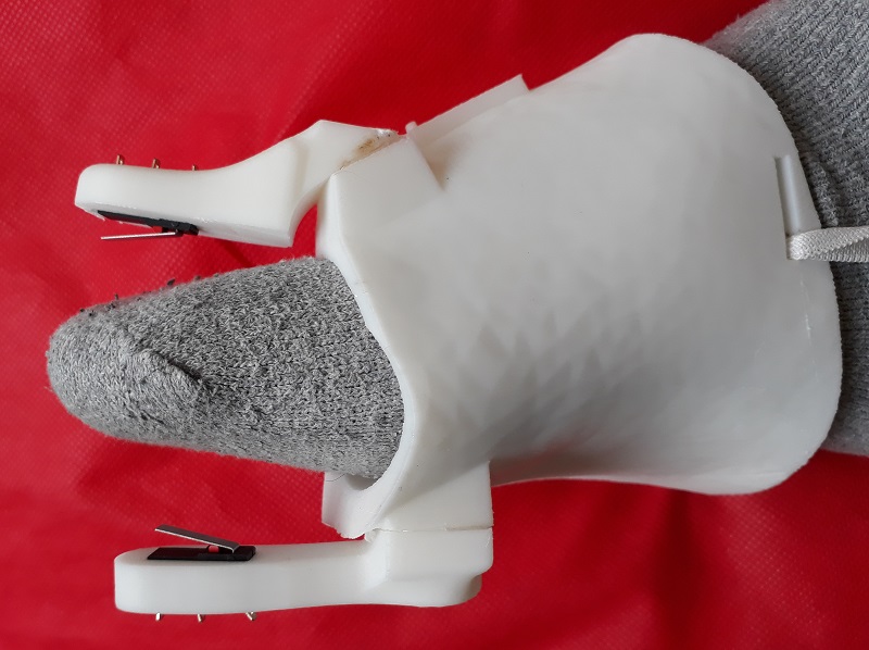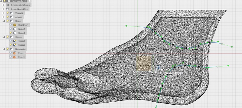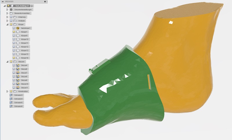 With my aim of my final project to show the potentials of a FabLab especially for people with disabilities I started the hardware design with a scan of my foot. Here my college peter helped me, because its impossible to scan his own foot with a hand-operated 3D-scanner. The generated .obj file I opened in meshmixer. Here I fixed some small errors in the 3d object and added a plain cut. See the scan below. Now I opened the file in fusion because I wanted to design a individual holding around the 3D-scan. To do so I had to generate a model out of the .obj file. Fusion is only able to handle up tp 10.000 surfaces to generate a model so I had to reduce my file. At the beginning there are more than 150.00 surfaces so I badly loosed a lot if accuracy but the result also looks nice. To get a fitting holding I generated a offset to my real scan and divided the scan. Now I cut with splines all unnecessary parts. See here the first design of the holding. To test the accuracy of fit I 3d printed this design. I needs a lot of support structure but the result looks quite good. The first idea was to print the holding in flexible material so you can put it on like a sock. But after the first tries with flexible materials I noticed, that I need hard parts to get reproduceable data of the motion sensor and also to install the necessary buttons. The connection of flexible and inflexible material wont work well. See here the fitting of the holding. The holding fits perfectly but I noticed it fits to good to get the necessary moving space. So with the holding on I´m unable to rotate or tilt my foot. So I had to update the design to get the needed free space. See in the picture below the disturbing parts. See here the updated holding also included two holes for a elastic band to keep the holding in position. Here I also added the plate for the sensor to get a plain surface. In this picture you see the complete system with the additional adapter for the sensor an the addons for the necessary button i´d like to control with my big toe. Also here they are developed around the 3D-scan so they are absolutely fitting to my individual foot geometry. See here the finished 3D-print. It fits perfectly and the buttons are easy to reach but not to close to activate them by mistake.