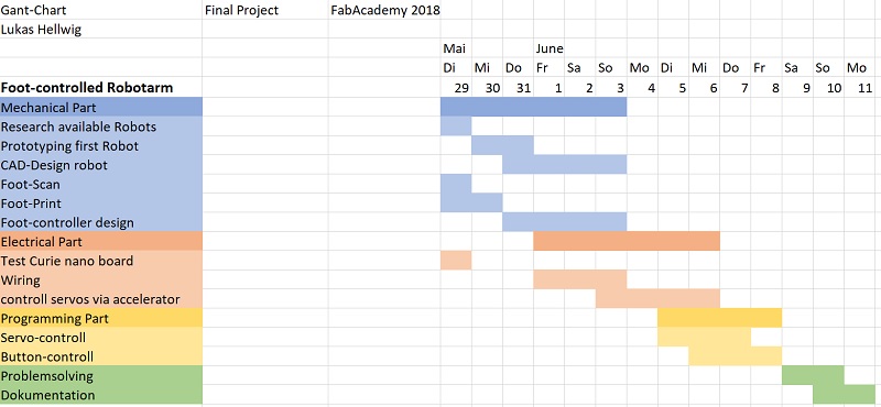 The main process will be the 3D design and printing. Additional I will use lasercutting, vinyl cut and electronic design. The other big part will be the programming of the controller. See below a detailed gant-chart for the next two weeks.