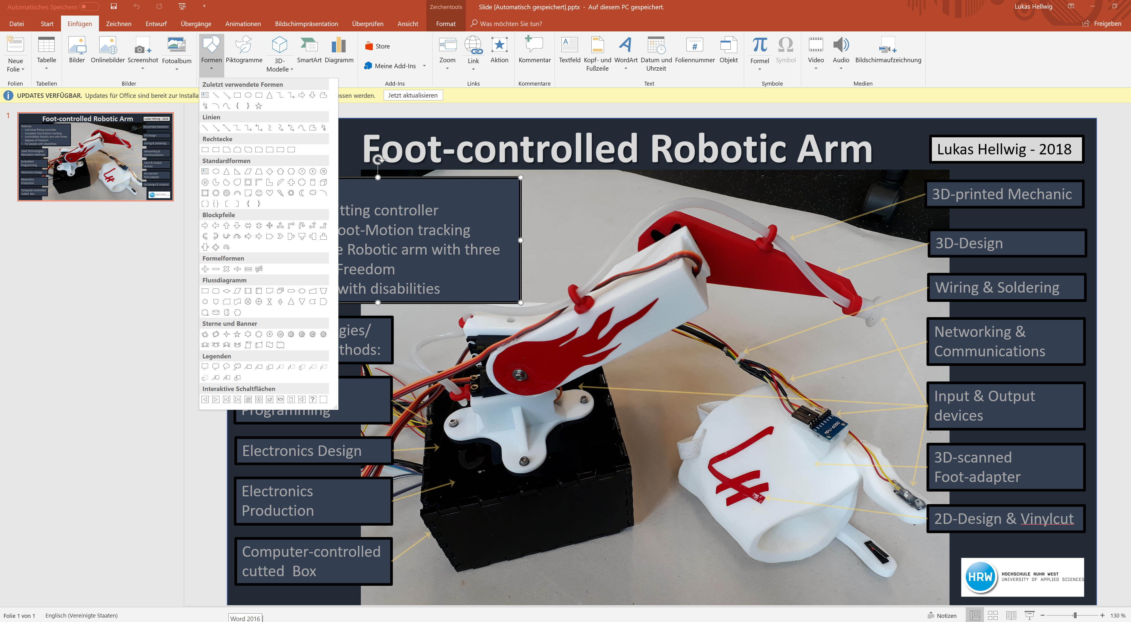 You also can easily ad references between object which allows you to moce single objects witout losing the connection. Powerpoint wors with different layers so cou can move all parts to any time. My final project is self introducing, so I made one photo in th ecenter and added all neseccary in sinple textboxes around this. Additions I added some arrows to show where the single technologies were used. See here the finl slide: