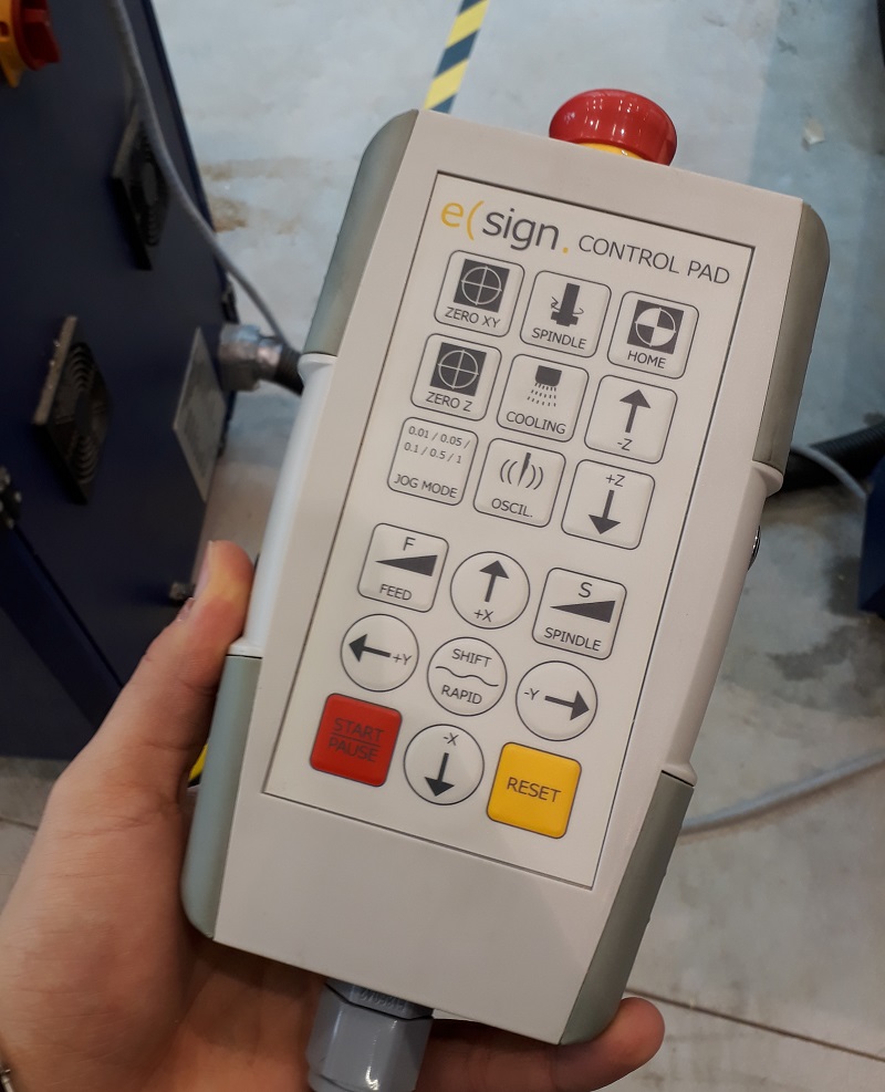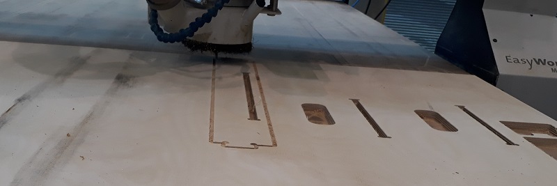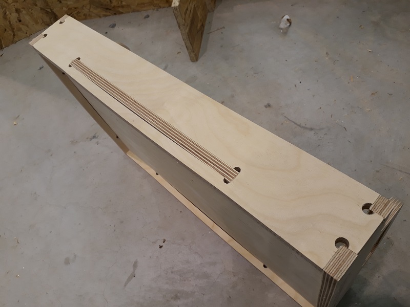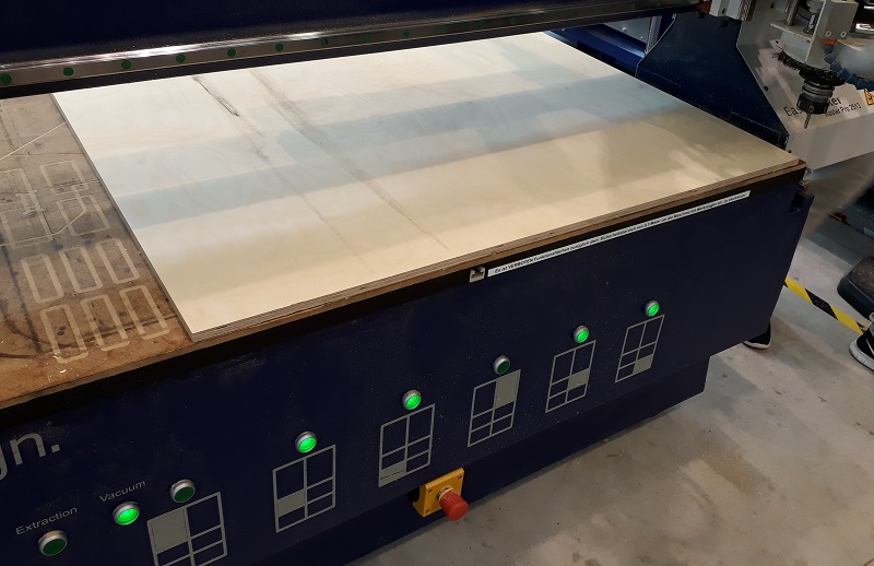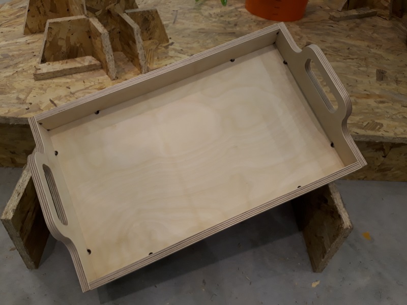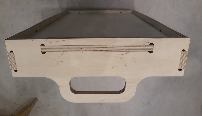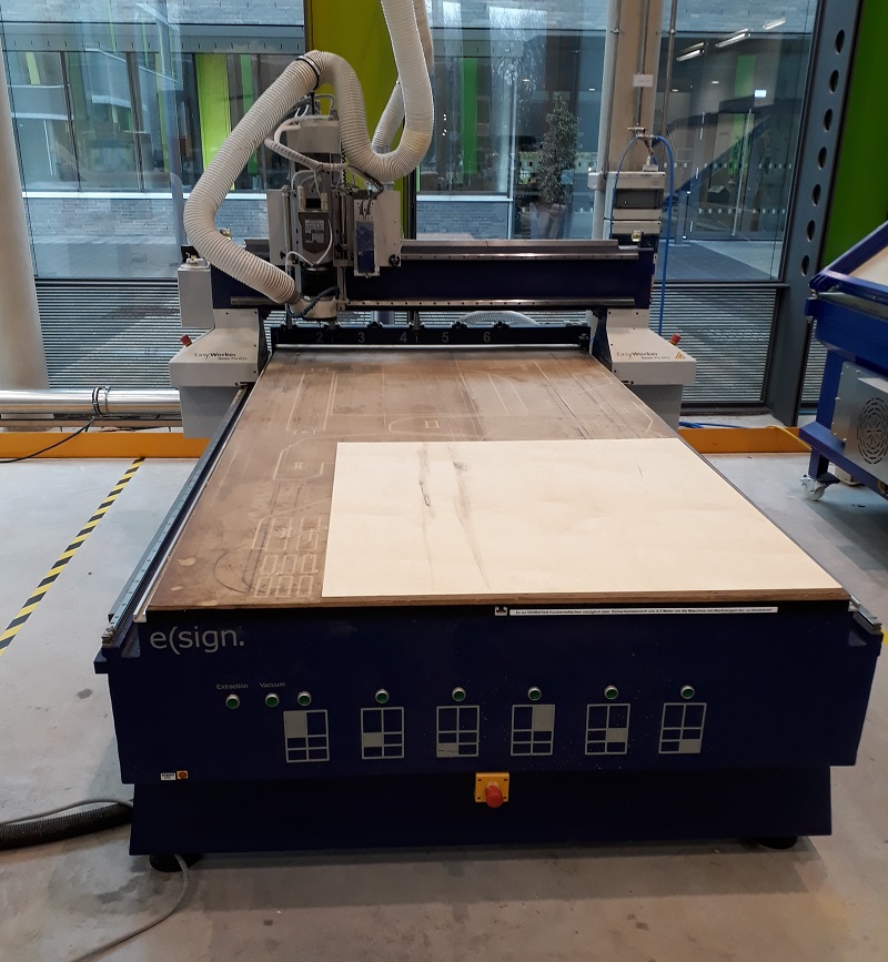 See here the connected tablet with all parts. Thats how it should look like. In my building center I only can find 12mm multiplex wood so it will be a quite strong tablet. I also had to edit my design, becouse I planned a thickness of 9 mm. Because of the paratemtric design that was only a fews clicks. The design includes the fact, that I wanted to use a 6mm cutting bit. So I added these 8mm holes in each inside corner to avoid postwork. Find the data in the download section below. I exported the sketches as .dxf parts from Fusion360. After that I had to do some steps in Rhino to avoid double lines and dividing the files in diffrent layers to separate in- and out-lines. After that step I could start the process. First I had to unlock the control center and start the elsign program. That is the control center with some additional buttons to interrupt the process quite quickly. This is the hand control with which you can move the milling spindle by hand. In the next step I needed it for the definition of the zero point. But first the machine needs to drive to the home point. After the machine goes automatically to the home point the control window show the new status. Before setting the zero point I had to check the right tools. I will work with the third tool with 6mm. with my design that is a good choice. See here the tool. Next step to drive the spindle with the hand control panel to the right corner. That is where the internal X and Y-axis starts. After driving the machine to the right corner as you see in the picture I can set the zero point for the X and Y-axis. Not the actually point is the starting point for all milling processes. Only the Z-axis is missing. For the Z-axis there is a special button. You place the defined button on the bottom of the milling bet and slowly go with the spindle down until it presses the button. Now your Z-axis is also leveled. See here my setting for the milling process: Safe-Z means the distance between machine bed and tool during traveling.30mm will be more than enough with a 12mm plate. Start-Z is in which height the milling process starts. Here I chose a 0.5mm offset. Final-Z means the height where the milling process ends. I chose a negative value to get a clear cut trough the complete plate. Z Increments is the height which is milled with each step. So for my cut from 12.5 so -0.2 mm I needed six rounds for a complete cut. Feedrate is the speed of the spindle while milling. For my multiplex wood 2000 is a good setting. PlungeRate is the same for drilling holes. And at least the spindle speed is how mandy rpm the tool makes. First I cut a test piece to test is the party fits to each other. Always start with the Inline cuts. See here the calculated tool path As you see in the red box the machine also shows the different circles which are needed to cut the complete wood. But before starting the milling process I needed to fix the plate at the machine bed. The EasyWorker uses a vacuum which sticks the plate material at the bottom. The bed is split into six areas. I chose only the four where my plate was lying. Also before starting the milling process I had to start the extraction of air to avoid a lot of dust. See here the first milled centimeters. The machine looks and sounds nice so the parameters are correct. See here the first milled centimeters. The machine looks and sounds nice so the parameters are correct. Aufter finishing my first parts I tried to put them together. As you see they fits quite good so I build a huge press-fit system. 😊 Putting the parts together needs a little bit of violence with a hammer but the connection gets quite strong so there is no screws or glue necessary. So now I can start the real production of my tablet.