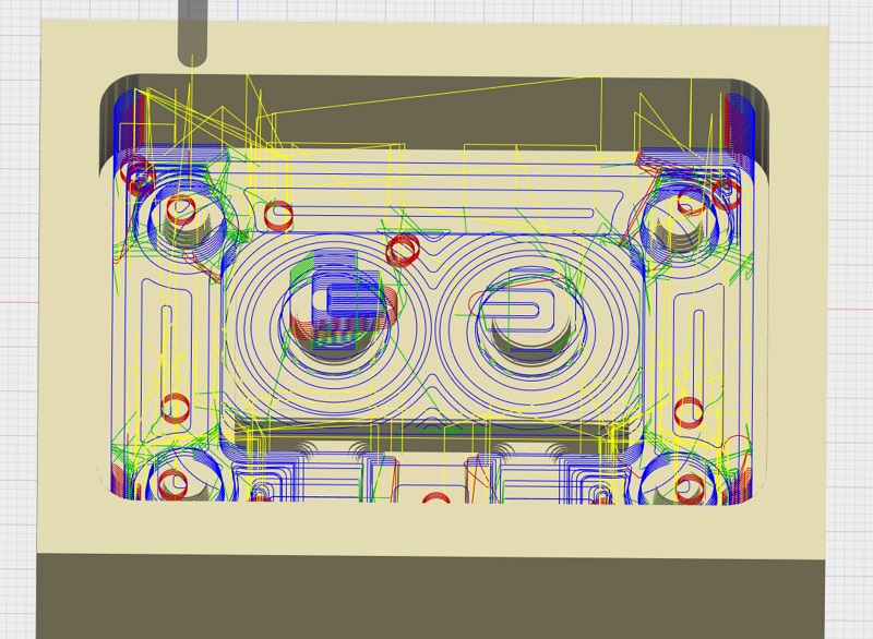 After I insert a few more settings to the adaptive clearing process like the maximum of tolerance fusion 360 automatically generate the toolpath. I didn´t changed the milling parameters at all because we used a quite simple to cut wax which didn´t need a optimization of the parameters. Also a had the option to control the speed later during the milling process manually. The red lines are the small spirals during a drilling process. The yellow lines are the ways without real contact with the workpiece and the blue lines are the path of the milling process. See below the first clearing process: