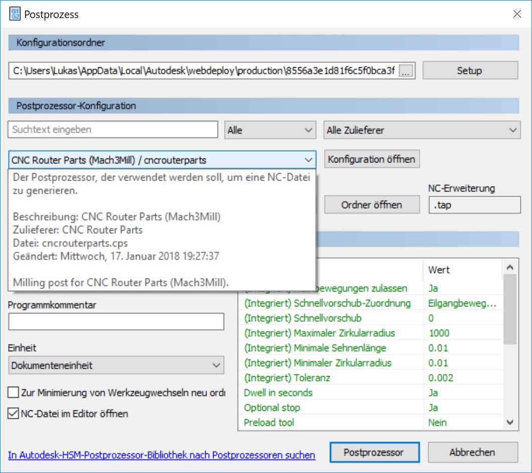 Now the final step is to export the toolpath as a readable file for the milling machine. I used the milling machine of Peter. It used the Mach3Mill software so I chose this option to get a .tap file. Now I can safe this file and transfer it to the working station if the milling machine.