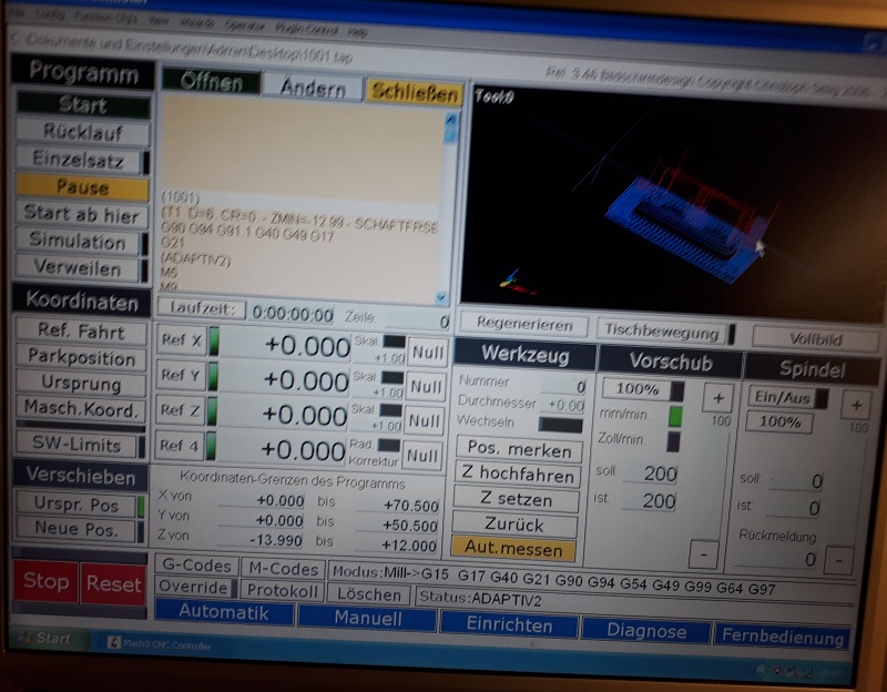 That is the surface of the milling software. The first step is to set the zero point. Therefor I moved the spindle manually to the correct point in X- and Y-direction above the workpiece. Not I zero the Y and X reference. After this I started the spindle and let is rotate as slow as possible. Now I drop the spindle in 0.01mm steps until it touch the surface of my workpiece. That is the zero point for my program.