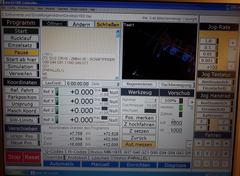 After opening the toolpath file you can see it in the black box at the right side. Also at the right site you can see the manually controlling panel for the movement of the spinde. There a steps up to 0.001mm possible.