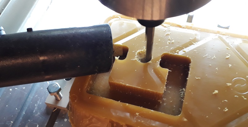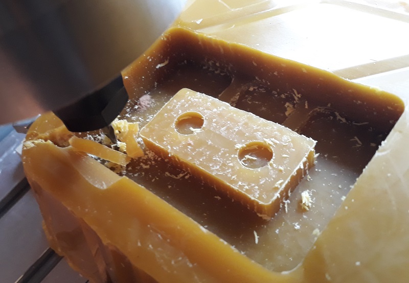 Before milling the special wax I run a test process with a PU-foam plate. See the video below. It sounds good ant the movements are fluent precise.