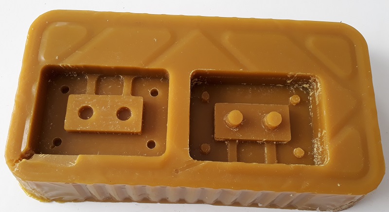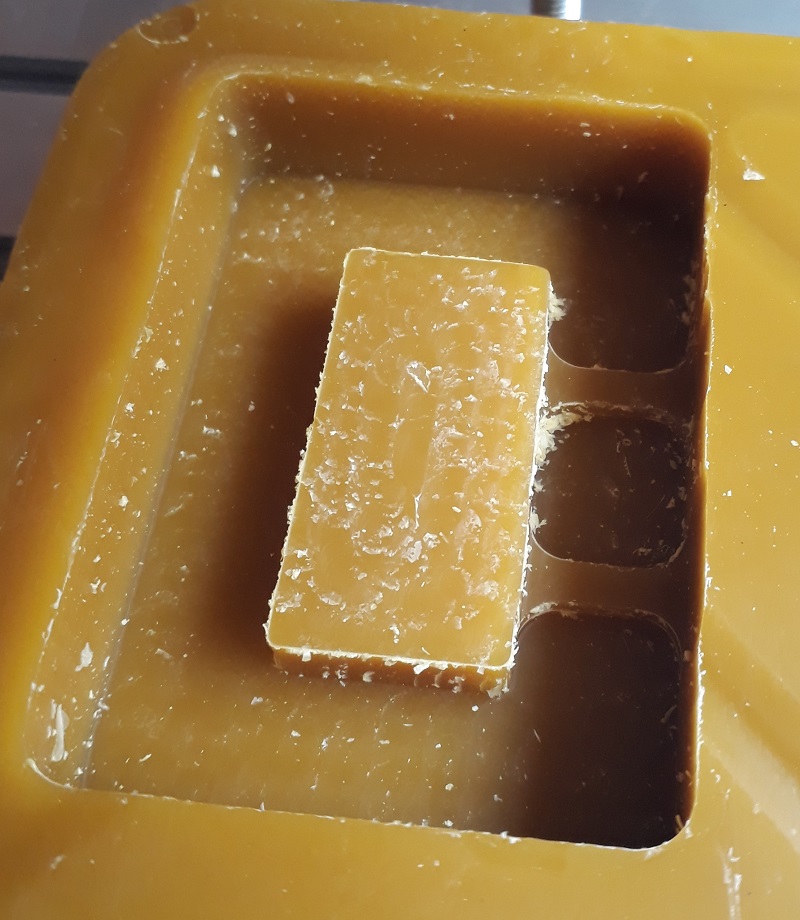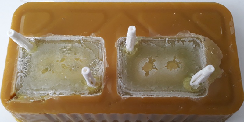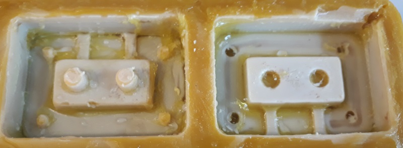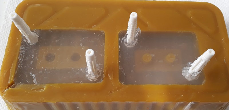 But after the first good looking impression I saw, that only the top 7mm of the silicone became hard. Also the transparent silicone become yellow and the wax faded. So notice: sanitary silicone is not the best chose for molding.