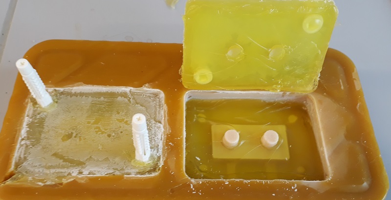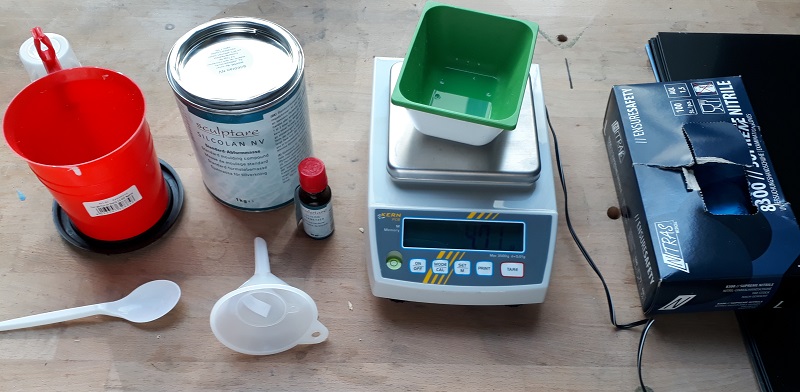 In the next try I used special sculpture silicone. I had to add 2% hardener and mix it . Therefore I used a precision scale and special containers. Find the important safetydatasheets in teh download section below.