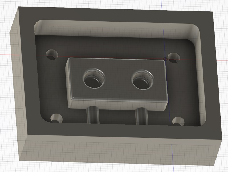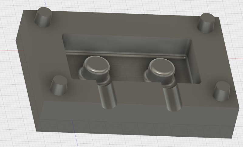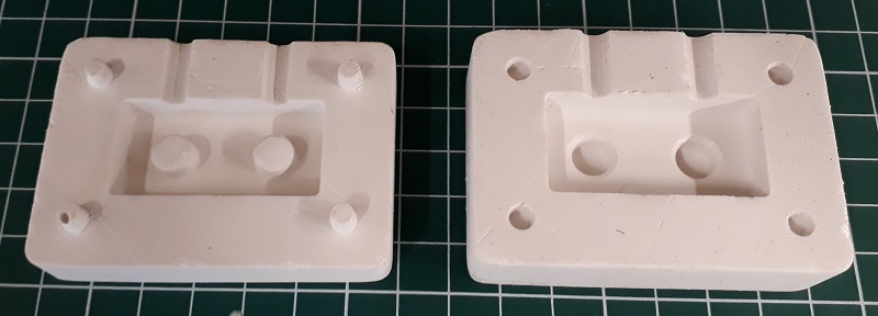 Now I had to generate a negative from my brick. That is a quite simple step in Fusion. Just generate a cube around the brick and subtract the brick from the cube. Finally separate the cube in two parts and you get the casting form below. There is a top and a bottom part. I added also four pins to connect the two parts with each other. That is what my casting form will look like: