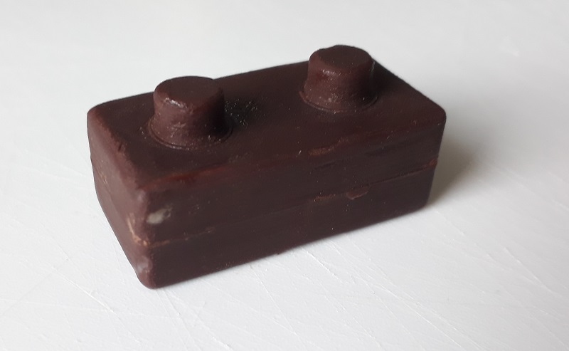 See here the final brick out of chocolate. After placing it for a few minutes In the freezer you can simply remove the brick. The next step is to build a chocolate brick wall.