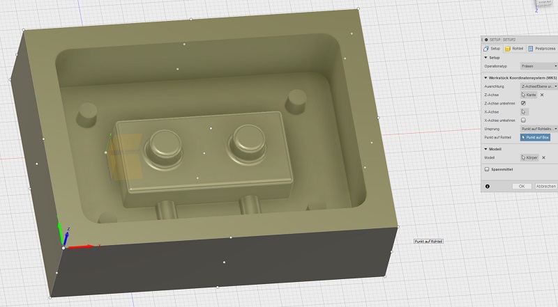 The next step is to generate the milling code. Therefore fusion 360 has ja CAM process included. Just chose the part you want to produce and click at the “CAM” process icon. The first step is always to generate a setup where you declare the settings of the process. So for example where the starting point is and in which direction the single axis are. You also set the area you want to cut.