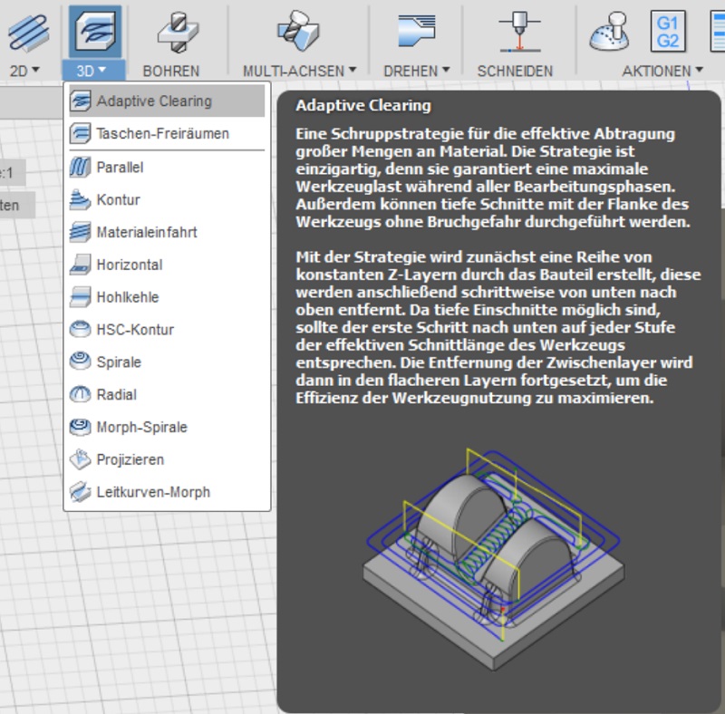 After finishing the setup there are a lot of different types of milling processes. Which one is the best depends on the geometry of the part you want to mill. Often you need more than one step to get the bets result. I started with the adaptive clearing process because it is a good option to remove a lot of material. The finishing follows in a second step.