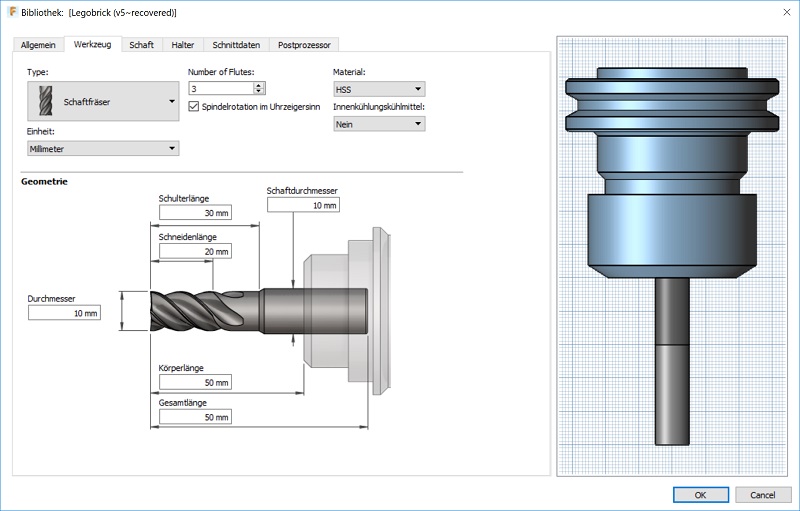 Now you have to insert the setting of the process to for example which tool you use. There are a lot of tools in the library but because I used a unknown milling machine I had to create a new tool for the library. You have to add a new tool and then describe it with a lot of dimensions and extra info. Therefore I had to measure the necessary dimensions directly at my milling machine. See below the surface of the tool adding process.