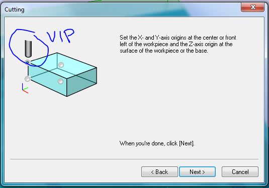 And the VERY important starting point for the cut, in most cases we'll use the front left corner of the tool, and this corresponds with XYZ0 as I've defined this on the machine....if not do it now!