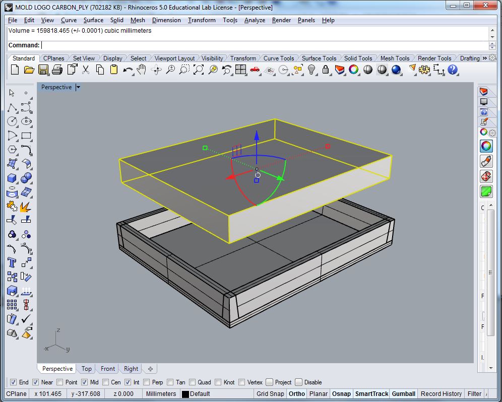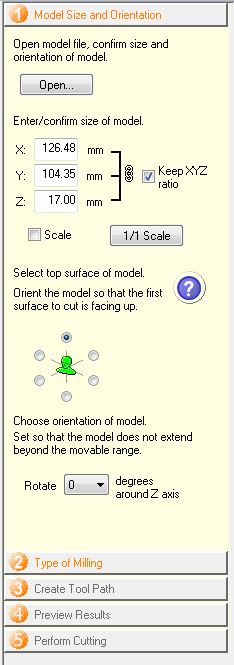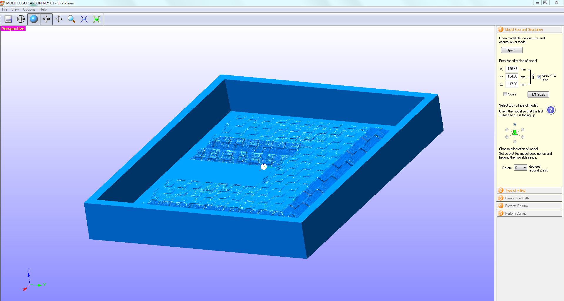 When loading the .stl file of the mould to be milled, the first step is to check the orientation of the tool to make sure it will fit with the stock material you are using, and that the orientation is correct! note the XYZ and how these correspond with your machine/part. Also note the dimensions of the model and the materials you're using (both should be measured prior to this step).