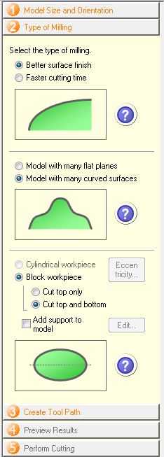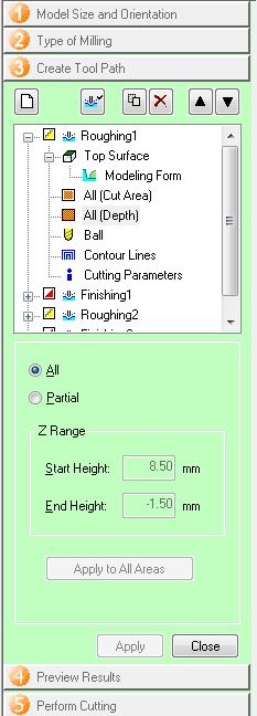 The next step is to define the type of milling used. Because I was dealing with so many very small surfaces, I opted for the slower but more accurate options. We are planning for two milling processes: Roughing 1, and Finishing 2...after these are defined I need to delete the other processes (e.g. Roughing 2).