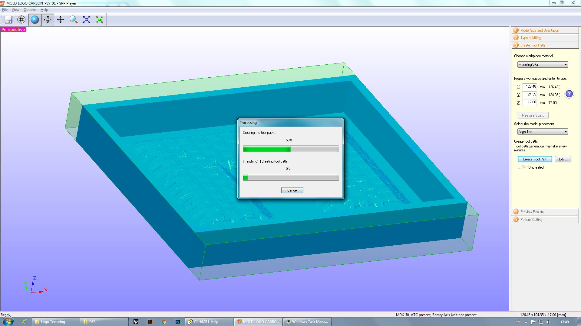I decided to cast a logo for my final project, using skills to make an intricate mould using the two-step process where a male mould is machined from the wax, and then a rubber is poured into this to create the female mould that can then be used to make the parts. Such a clever way of doing it, but quite a struggle mentally at first! Here are some of the early cad models, I wasn't sure how deep to make the parts, but opted for the shallower option (7 mm deep x 105 mm wide) to make it quicker to machine, but also in the end I also want to make one of these 'plaques' out of carbon fibre. The idea with the cast part for this week is to make it LOOK like carbon fibre by applying a woven or at least a texture that is recognisably like that of carbon fibre.