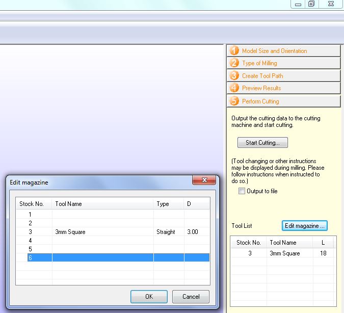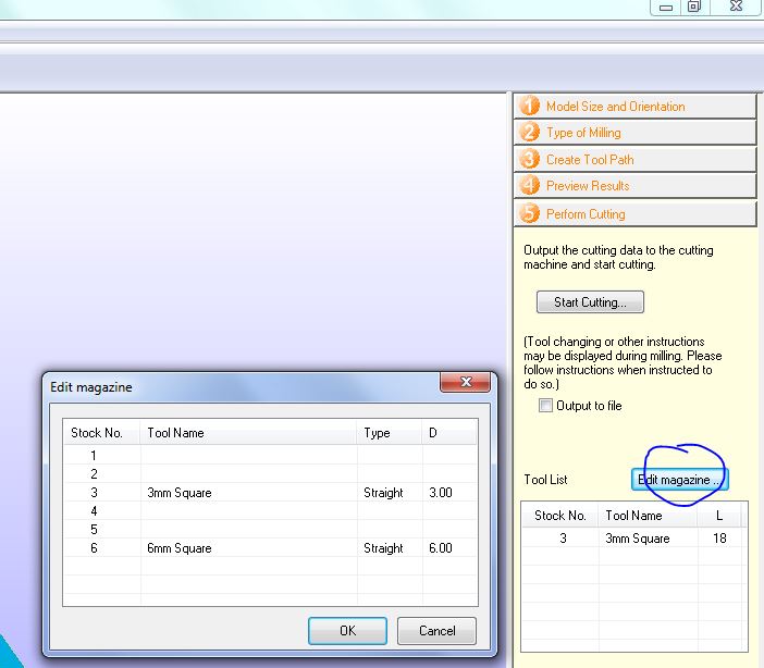 We then edit the Magazine and make sure that the correct cutting tools are in the correct place on the CNC milling machine. In our case here, the 3mm flat cutter was in tool 3 in our machine. We also want to delete any unwanted/unused tools from the magazine list. In this case we right clicked on the tool and reset it so it disappeared from the list.