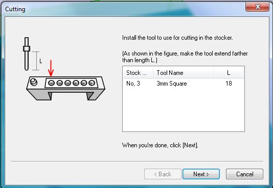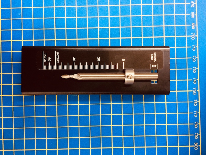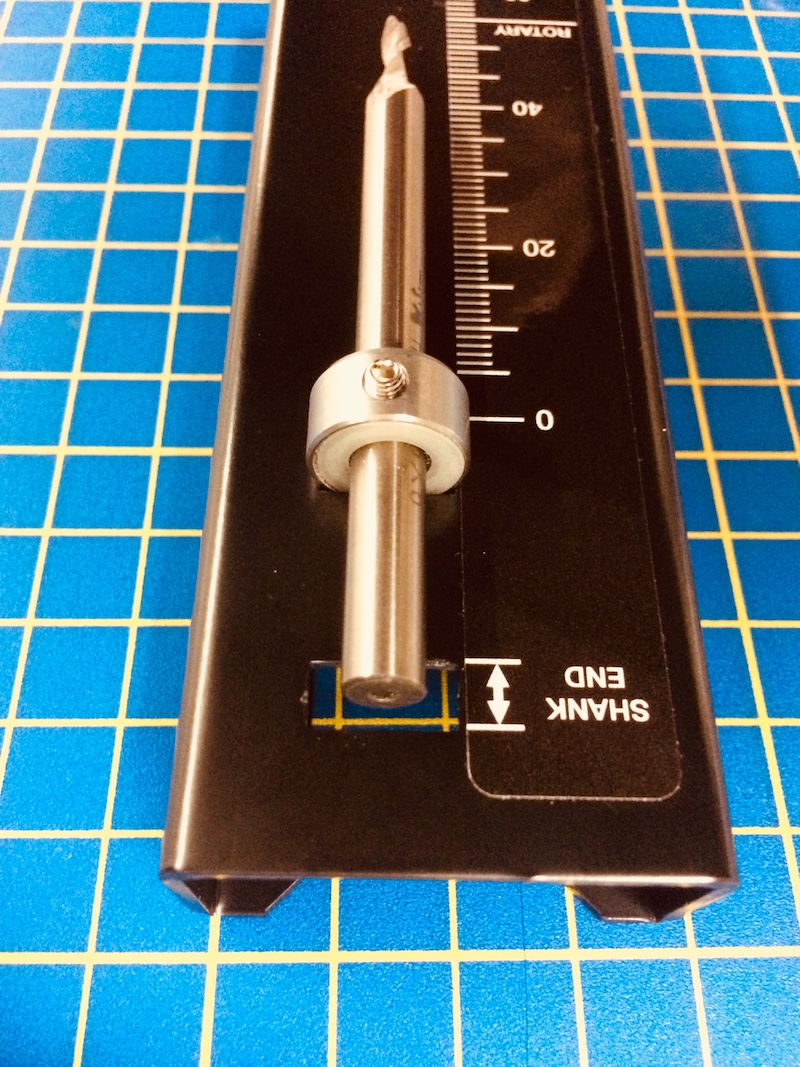 You place the bit into the tool making sure that the end shank position lies within the limits shown on the tool. You then also note the length from the bottom of the collet to the cutting end.