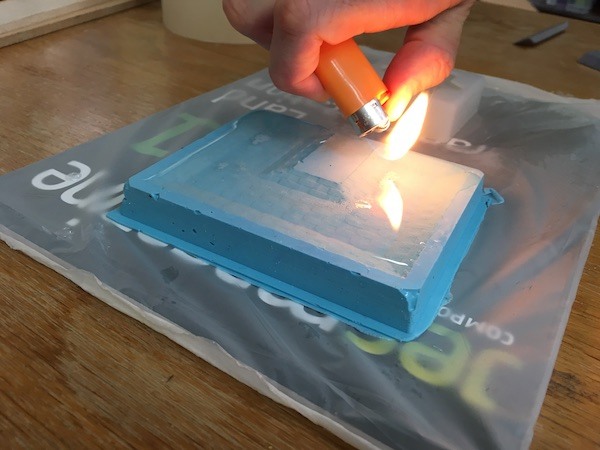 We then tapped the table to bring bubbles up from inside the mould (like concrete shakers), and removed the surface bubbles using a lighter...works a treat!