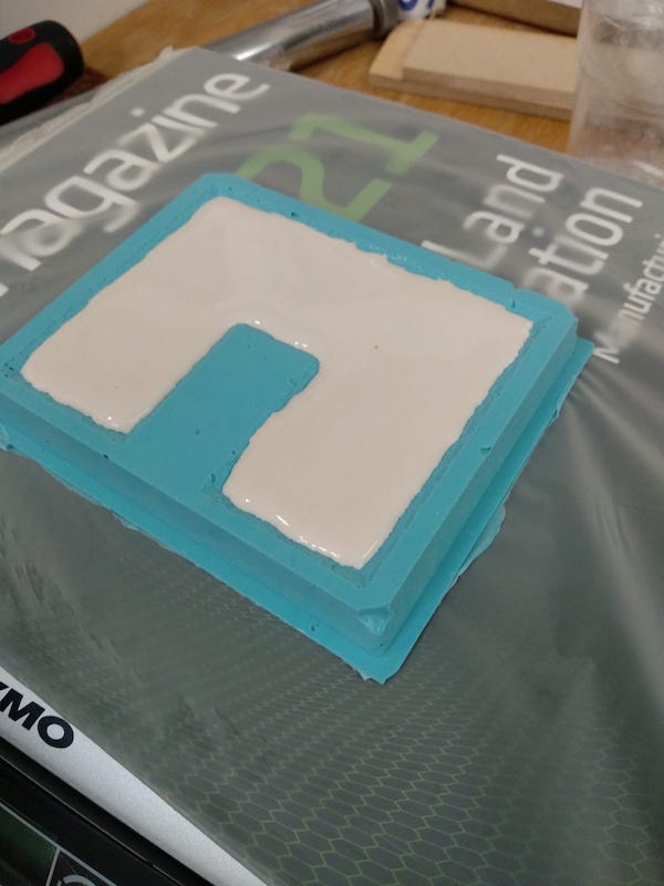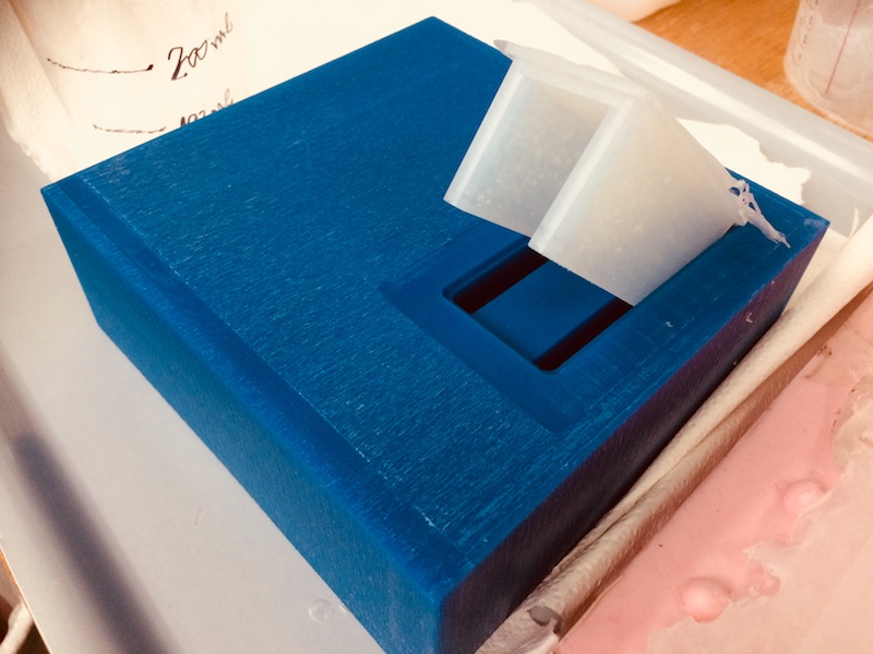 Machining the mould was quite straight forward using the same approaches that we've been using for milling our boards. Once the mould is machined, we measured out our 2-part silicone using the overall part volume needed, then halving this number to give us the volume needed for both parts (1:1 ratio required). I tried two different silicones, a very fast setting (2 minutes) clear silicone which is quite stiff, and a much longer setting (approx. 3 hours) pink silicone.