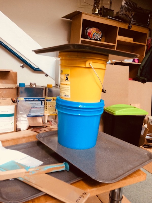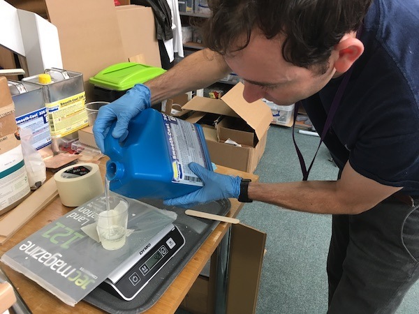 Scraping the last bits, then a desperate attempt to get the top flat...I put a restaurant tray on top with about 10 kg mass to try to press it down flat...after a few hours the sample offcuts were still slightly tacky (should have set in 75mins), so best to leave it overnight. Fingers crossed!