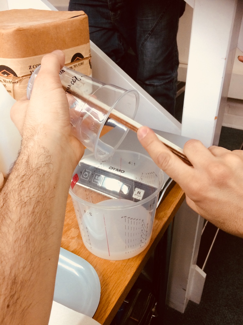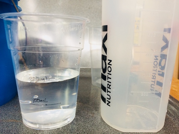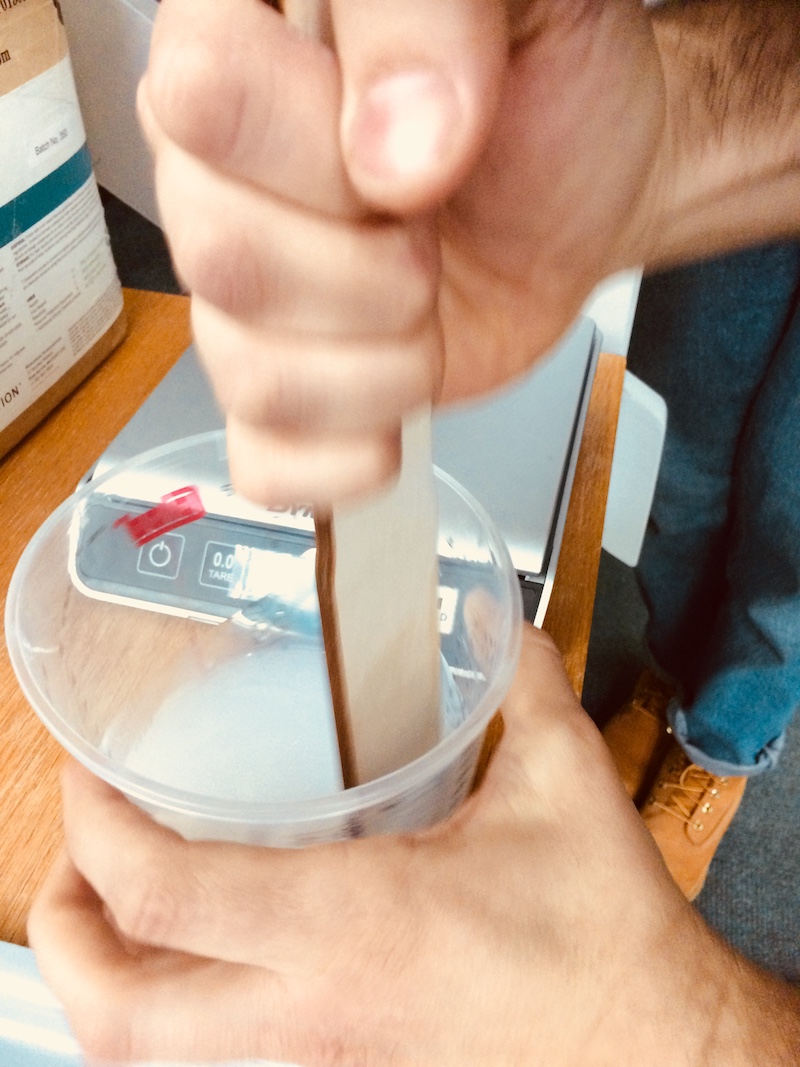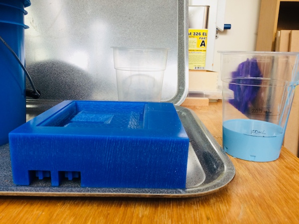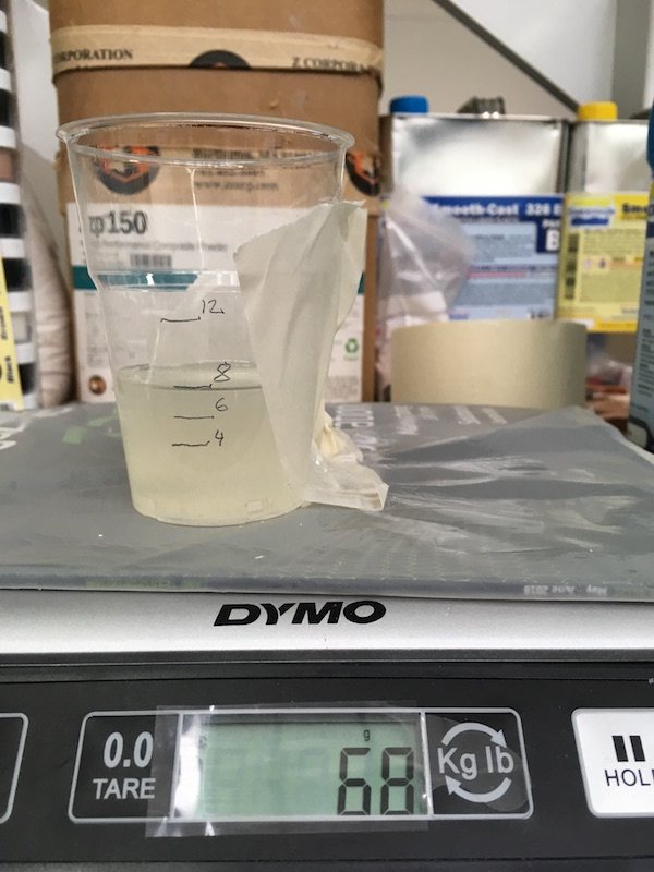 I used the mould tool model I created in Rhinoceros to measure the approximate volume needed. It turned out to be 160 mL, minus the original volume of the part itself of 40 mL so 120 mL. I rounded this up to 200mL, just in case there is some shrinkage or spillage, but also because we wanted to use a bit of leftover material to make a squeegee to clean the Roland CNC milling machine.