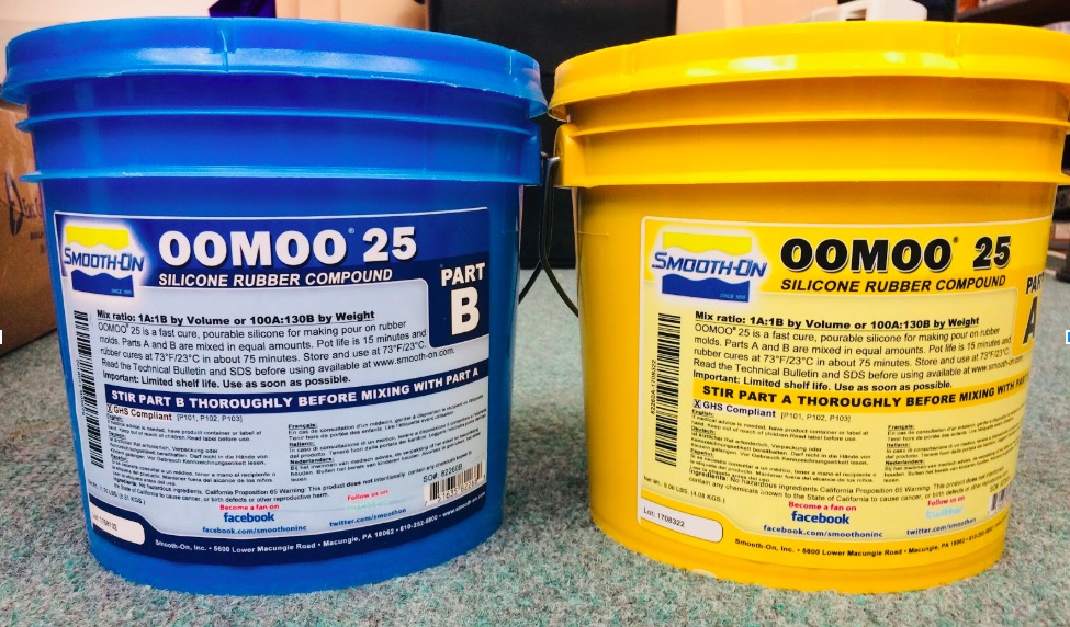 I used a two part silicone rubber compound called Oomoo25, some of the other guys had used it and it was a very nice silicone. It requires a 1:1 by volume ratio between part 1 and part 2.