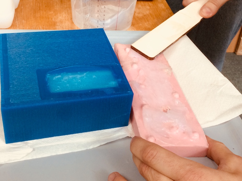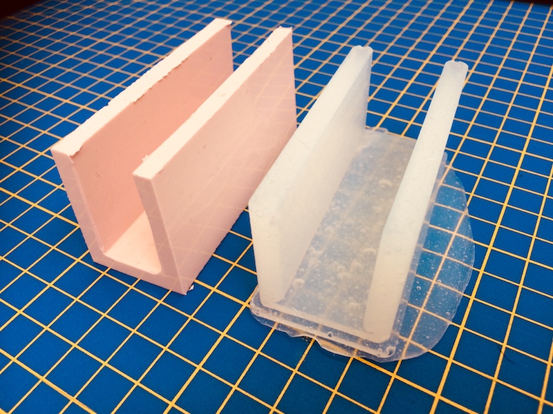 We then did the same in the pink silicone, but we had much longer to mix it (tens of minutes), being careful not to include air bubbles, and we degassed it also to make sure there was nothing inside. The pink model was much smoother, with a (mostly) great surface finish. As a material, it is much more flexible too, and not nearly as strong. The clear silicone is much tougher, more hard wearing.