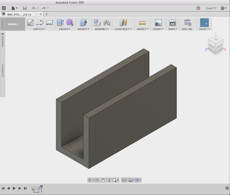 This week was also timed nicely with a request for a part that I received by a colleague in the clinical imaging centre (in fact I did this part first...just to have a quick go at the process). They wanted a small silicone part to hold some spinal cords while they were doing some testing using ultrasound and MRI scanners. While a simple part that could be made using an assembly mould (i.e. that doesn't actually require machining), it fit nicely with this week's project so I decided to make it by machining the mould. So this is the 'MRI standoff' part as they called it. I created it in Autodesk Fusion 360. It's 80 mm long x 40 mm high x 30 mm wide, with 5 mm wall thickness all round. This I used to create a drawing to send to my colleagues to check that it was suitable.