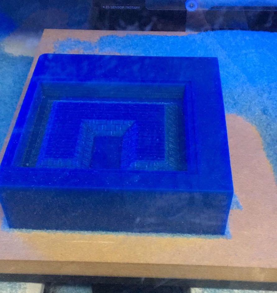 I then needed to subtract the part from a solid block, with the part inverted so that the bottom was flush with the top of the block - as this is where it will be machined from, effectively leaving a bit void from the top with two slots running down the side into the block. It was a relatively straight forward process to then bring this into the SRP player software, although when allocating the tools to the various passes I realised that the tool wouldn't cut the sharp vertical edges in the cavity, so I went back, rounded these off by creating a fillet with the same radius of the tool (2mm).