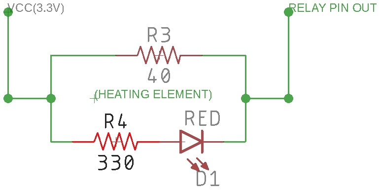 thermostatic control with thermistor, relay, LED and now heating element added in parallel with the LED+resistor.