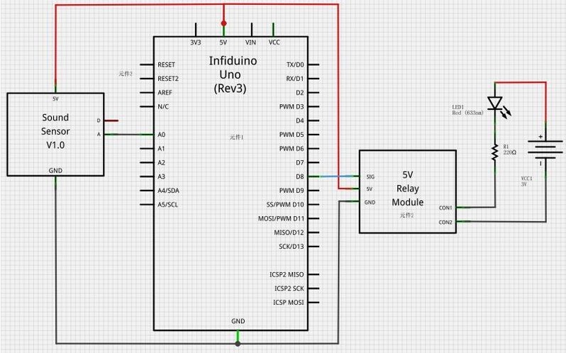 I then managed to get the relay to work using the sound sensor as input, where if a threshold sound level is reached (e.g. a clap or whistle), the relay will then turn on an LED which is powered using an external power source (in this code simply the 3V power supply on the arduino uno board.