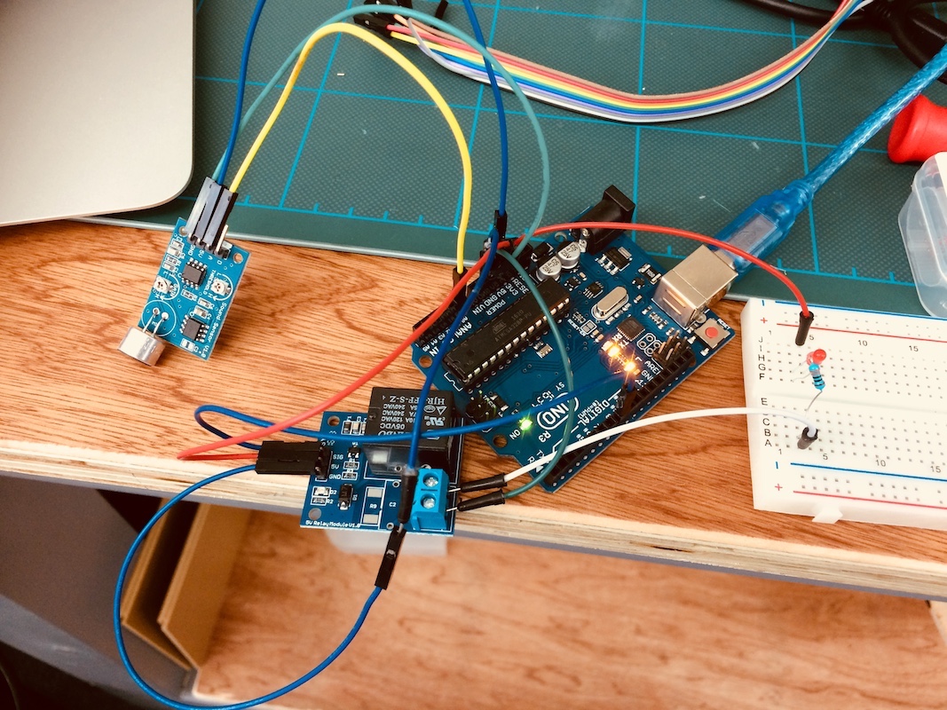 and here's the basic setup with the sound sensor, the relay driving the LED, and the LED on the breadboard.: