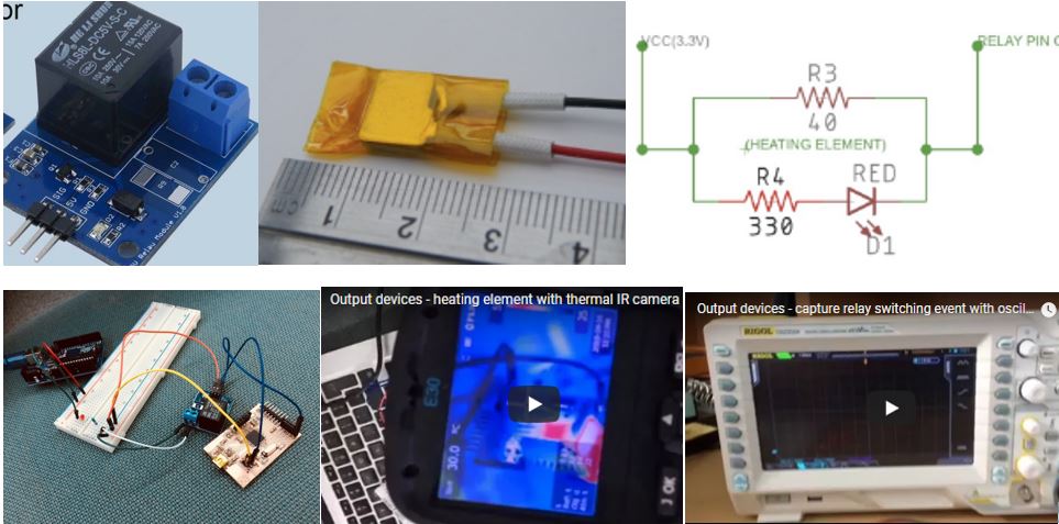 This week I wanted to tie this to my final project, focusing on producing and controlling heat. Here's the relay shield I want to try out with last week's circuit (to measure temperature), with a basic heating element (5V/12V/24V up to 230 degreesC). This relay should work also with my final project, but these heating elements are only low power (3-12 Watts) and so won't be powerful enough for my final project (more like 150-200 Watts needed, e.g. 24V and 8.3 Amps will deliver 200 Watts).