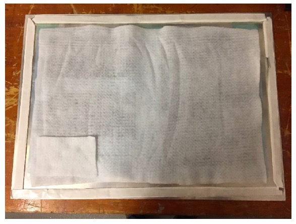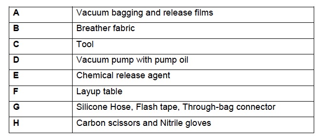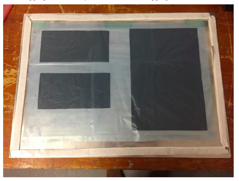Then cut the plies and lay them down on top of each other in the arrangement that's needed. For larger numbers of plies, place a perforated layer on top so they can be 'debulked' before final curing. Place the gum sealant tape around the perimeter to bind and seal the top impermeable vacuum bag layer.