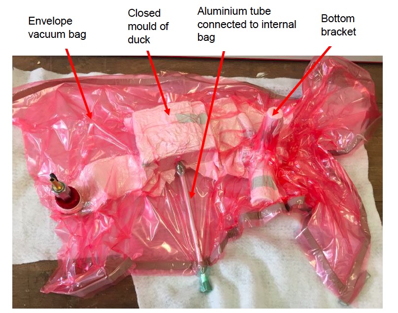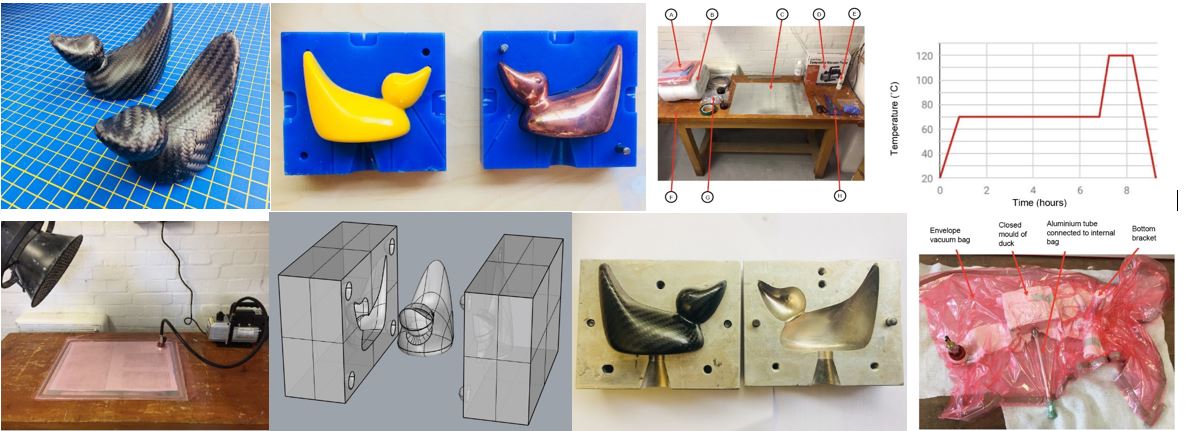 - layed up several plaques and a carbon fibre duck using vacuum bagging of pre-preg materials in an oven through a specified curing cycle