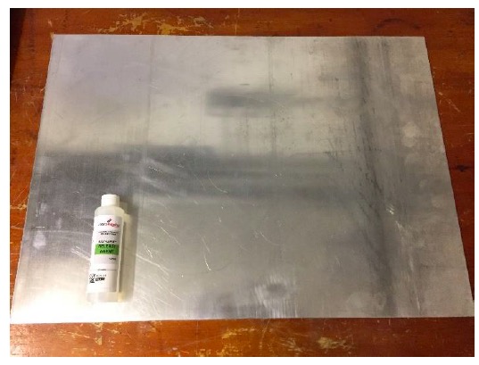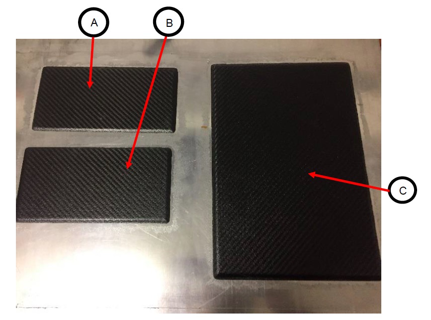 Initially we wanted to make some flat samples (plaques), with varying number of plies (A+B= 9 plies: 200x100x2mm, C=18 plies: 300x200x4mm). These could then be used as part of our materials labs to measure the mechanical properties of some carbon fibre samples and compare their behaviour to other materials that we test in the lab (mostly metals and plastics). The first step is to put down six coats of release agent onto the aluminium plate.