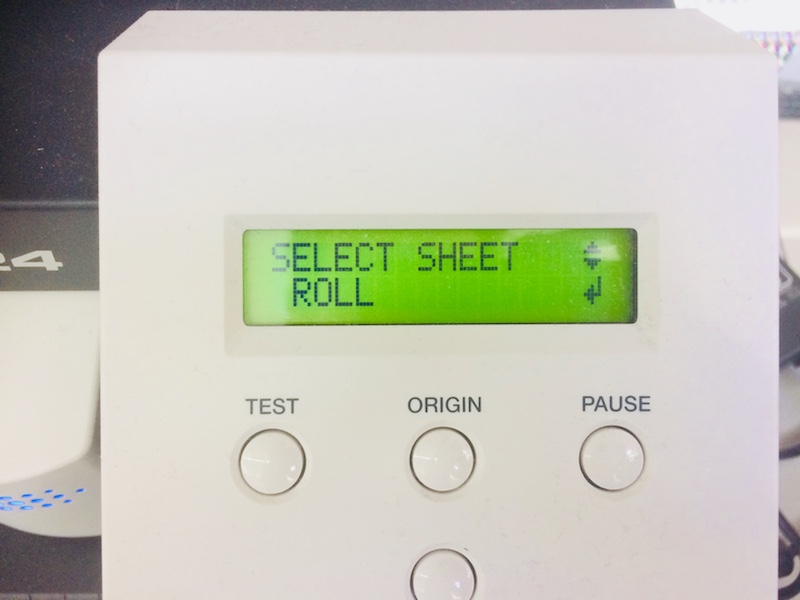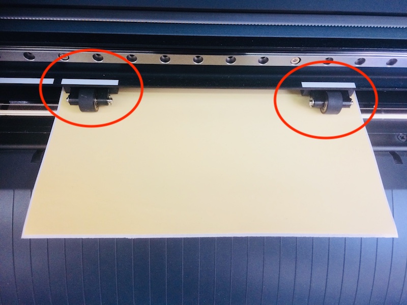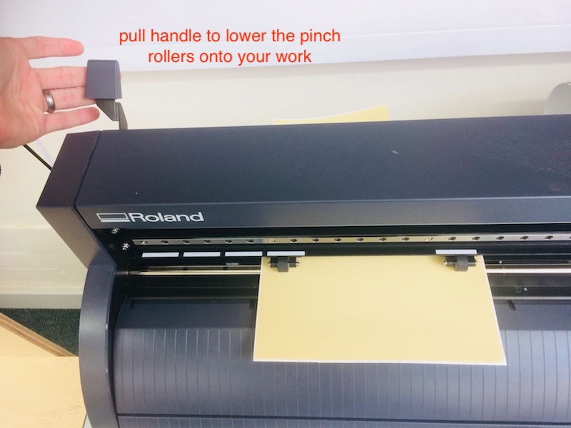 Setting up the machine. Firstly, turn the machine on, then push the handle at the back of the machine to raise the pinch rollers. Put your material in and make sure that the pinch rollers are within the white labels otherwise they won't be secure!! here's an example of how to do this.