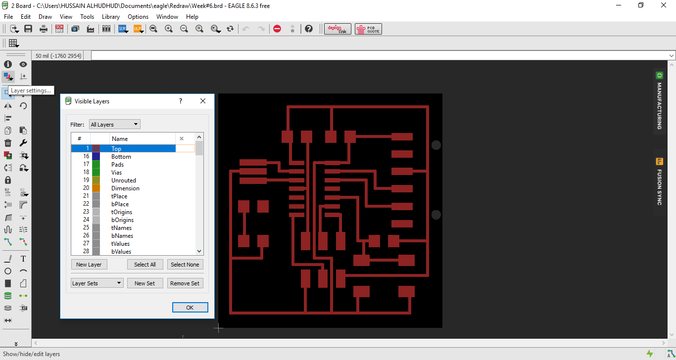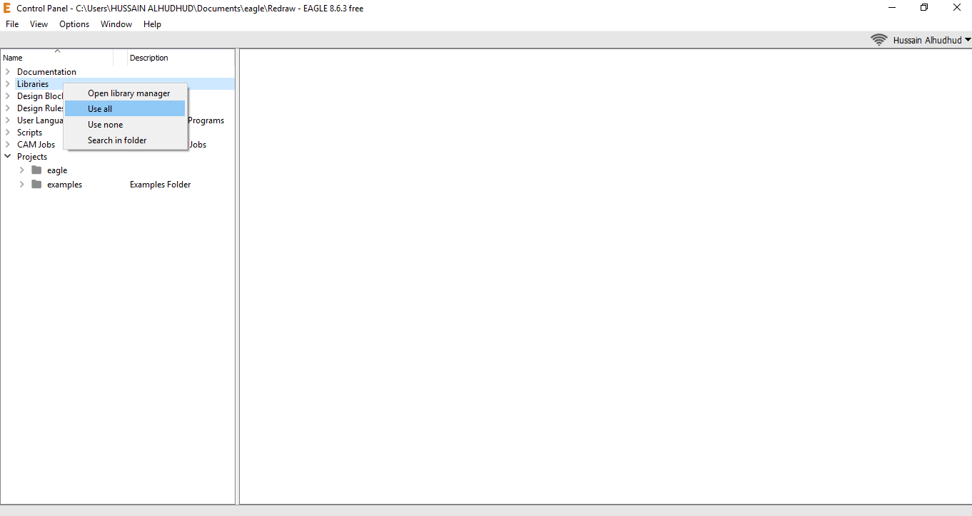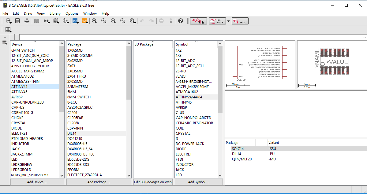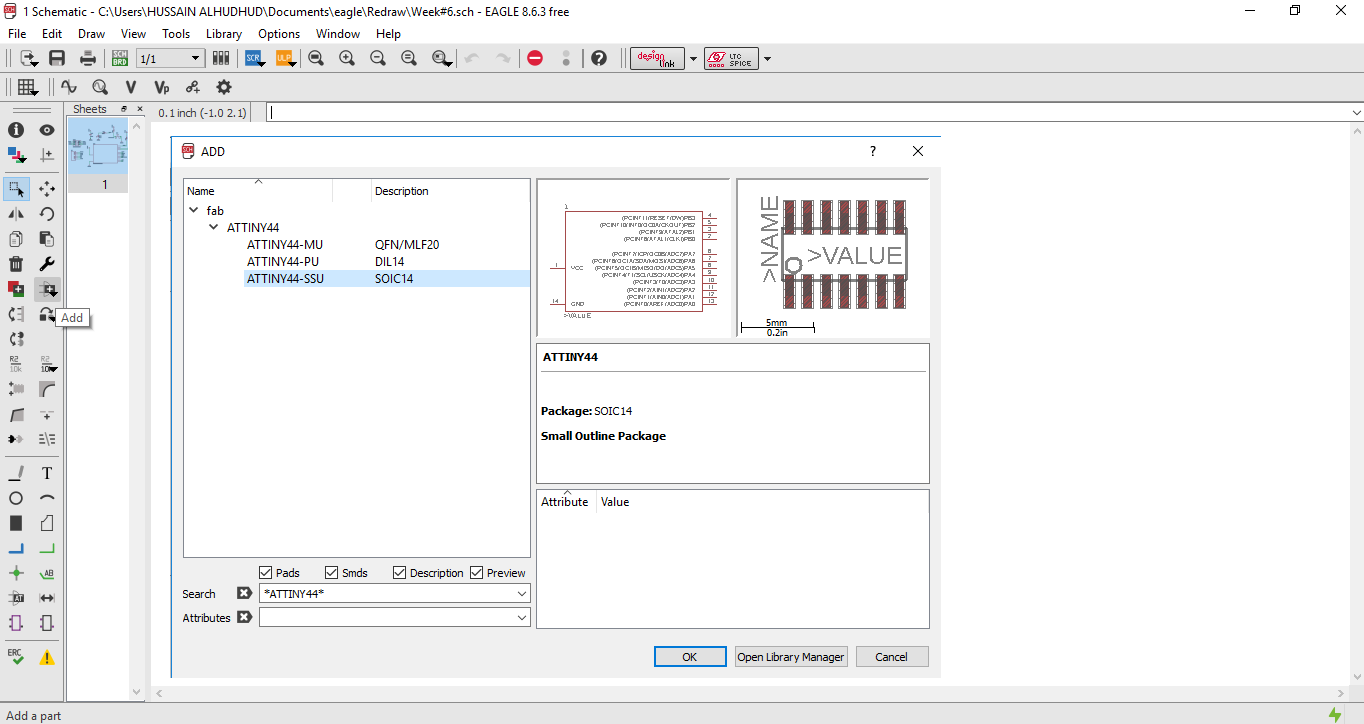 It was interesting to use Eagle Software for the first time.Step one was reading the tutorial carefully to learn the concept behind this assignment. Next I did a little practice following the tutorial "echo hello-world board" and I faced one thing that gets me a little confused about how search in the library to find the right components. Later on, I figure out that I have to open the library before to starting dropdown components. By the way, I had download fab.lb which provides by fab network also maintains a library, so that I can easily find the components. All you need to open the fab.lb is copying files to the director library of Eagle and open the software then go to library on the left list right click and choose use all.