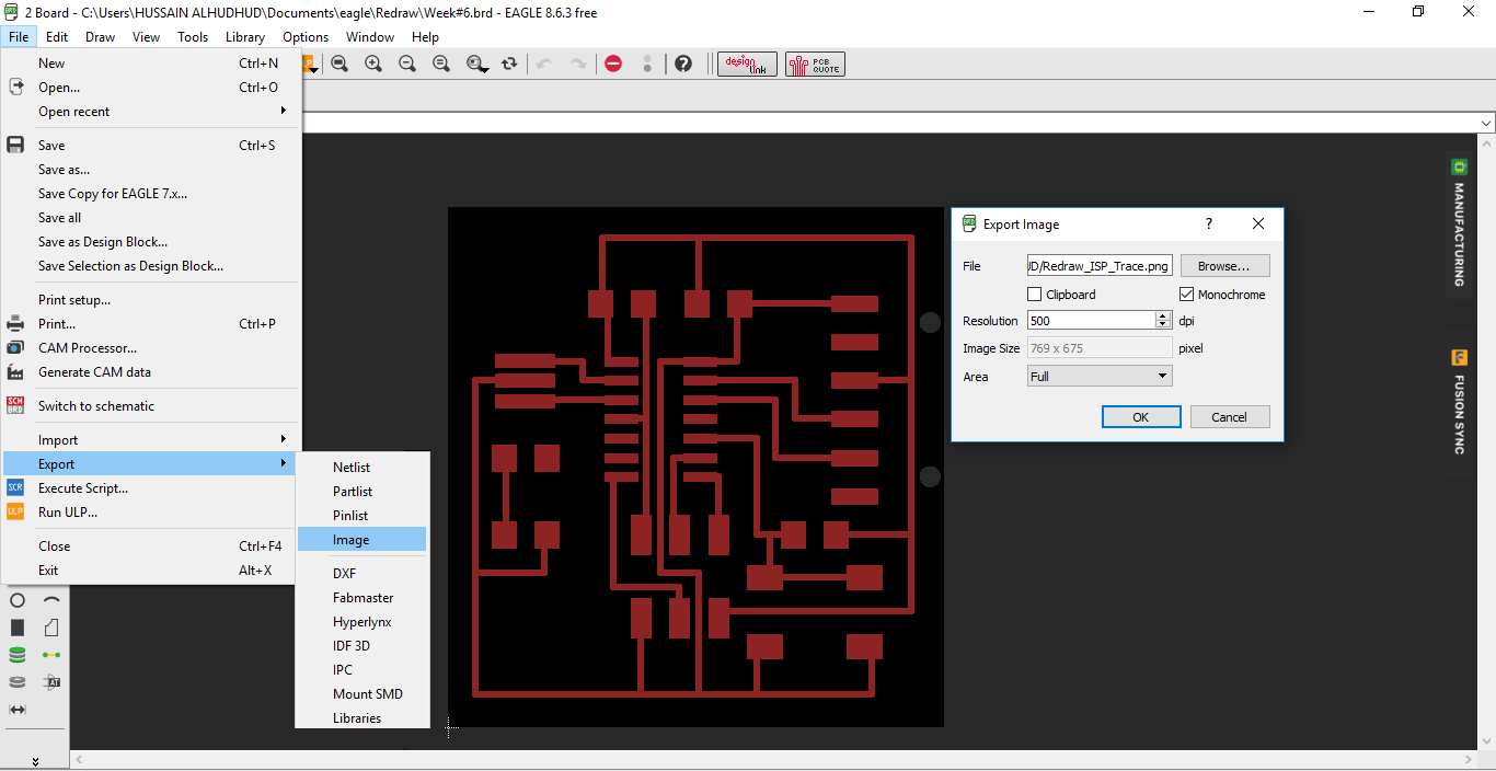Save the board as an image for a reslotion 500 dpi and check in Monochrome even the image become white and black