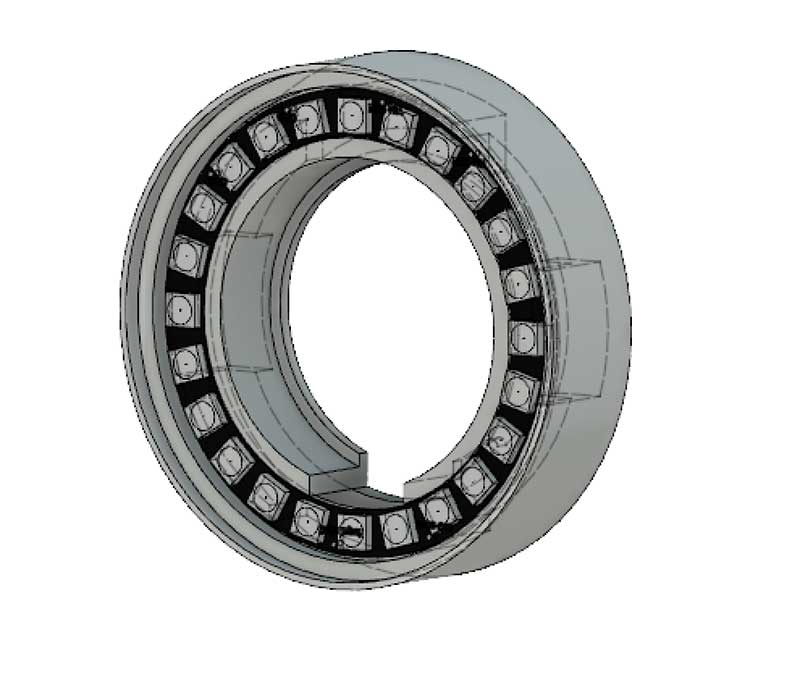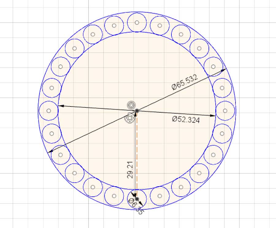 I took all the measurements from the schematics for the Neopixel ring on the Adafruit page HERE. I then used the circular pattern tool to create a pattern of 24 circles around the ring. The size of the circle was just big enough to hide the white square body of the actual LED. This worked out pretty well.